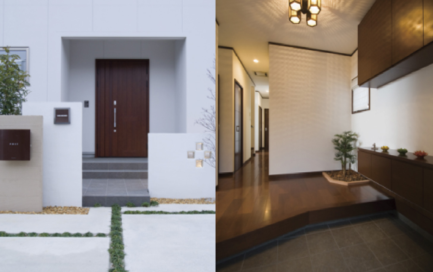 シンプルで洗練された外観デザインと、温かみを感じさせる木目の玄関ドアが印象的なお住まいです。門柱やアプローチには植栽や照明を効果的に配置し、昼は爽やかな表情を、夜はやわらかな光がご家族を迎える演出を施しました。